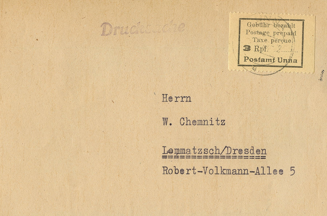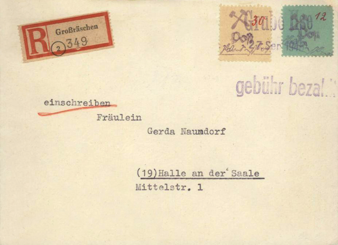 [Below: This time they used blue ink and it hid the forbidden symbol even less. Someone went to an Allied concentration camp for this mistake. This was postmarked on November 12, 1949.]
