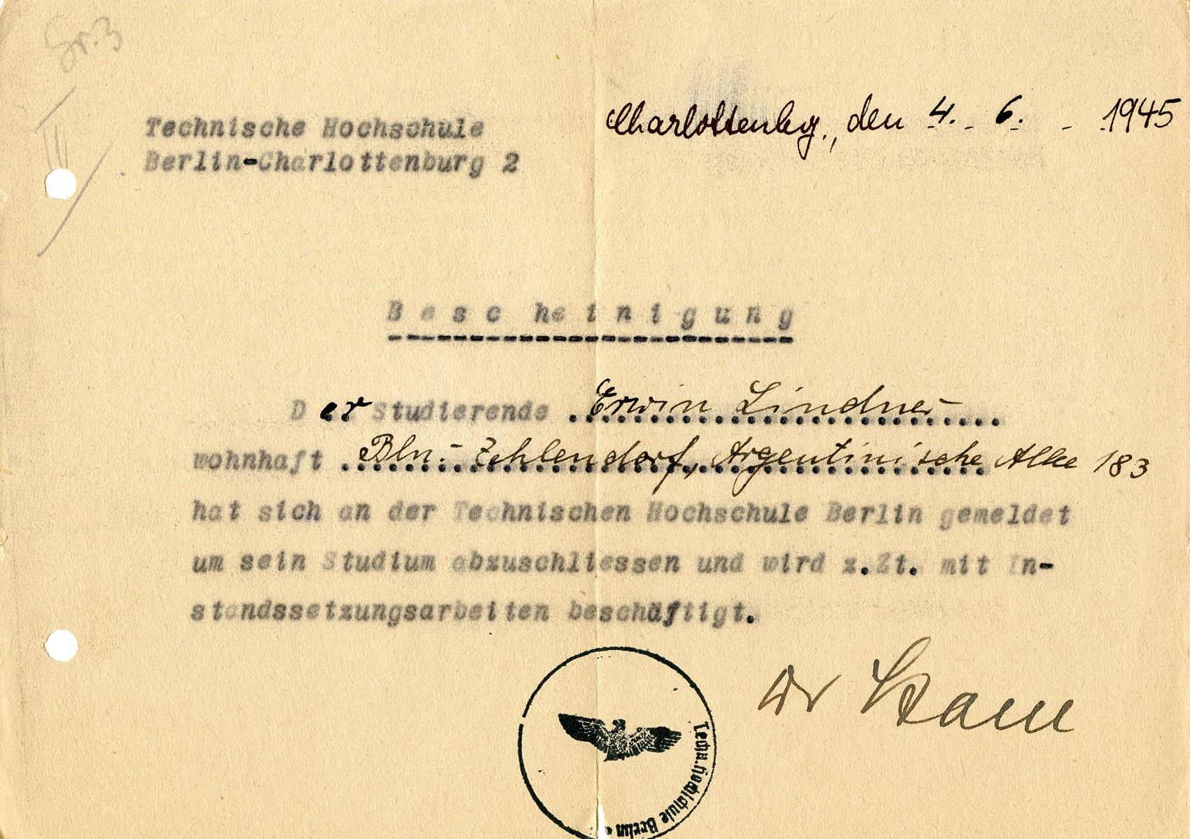 [Below: This is a letter of proficiency. Check out the horribly butchered eagle. Dated June 4, 1945.]
