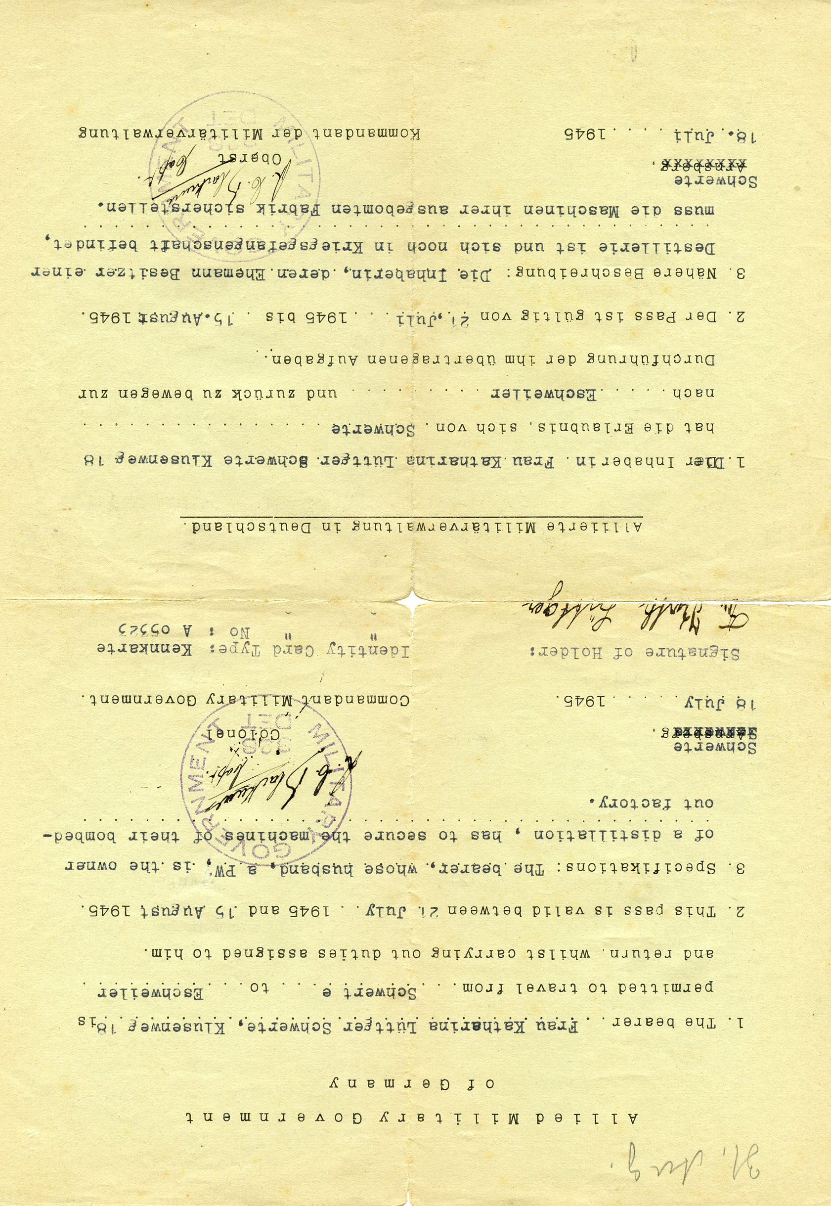[Below: An interesting pass for a woman to 'secure the machines of their bombed-out factory'. Dated July 18, 1945 and issued to a woman named Katherine Lüttger.]