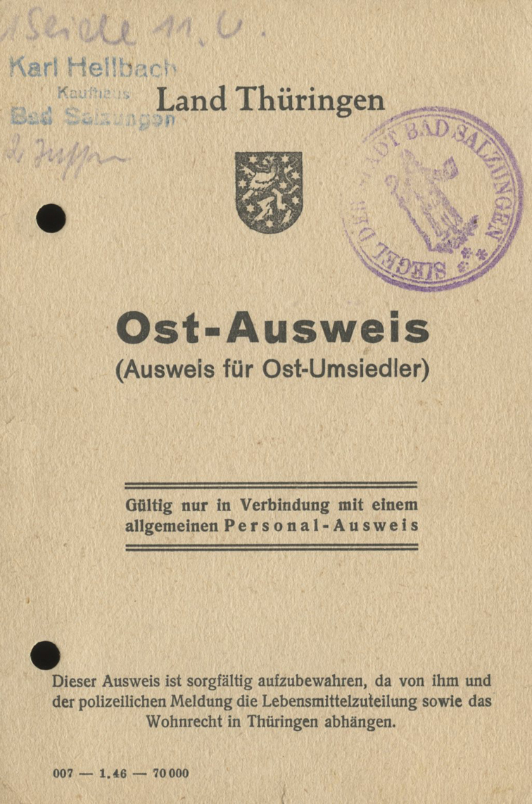 [Below: Allied occupation I.D. from Thuringia, 1946. It says: 'Ausweis für Ost-Umsiedler' (ID card for resettlers from the East). More like Germans who had their lands stolen, creating the largest human migration in history. But this person's card in particular might be a refugee from Breslau, which was utterly destroyed by the communists. Click to see more.]