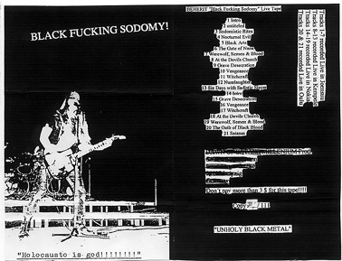 This hand-numbered bootleg cassette contains the following live tracks, which were recorded in four different locations. Like always, I've written them with typos intact.They are 'Intro,' 'Untitled,' 'Sodomistic Rites,' 'Nocturnal Evil,' 'Black Arts,' 'The Gate of Nana,' 'Werewolf, Semen and Blood,' 'At the Devils Church,' 'Grave Desecration,' 'Vengeance,' 'Witchcraft,' 'Nunslaughter,' 'Six Days with Sadistic Slayer,' 'Intro,' 'Grave Desecration,' 'Vengeance,' 'Witchcraft,' 'At the Devils Church,' 'Werewolf, Semen and Blood,' 'The Oath of Black Blood' and 'Satanas.'