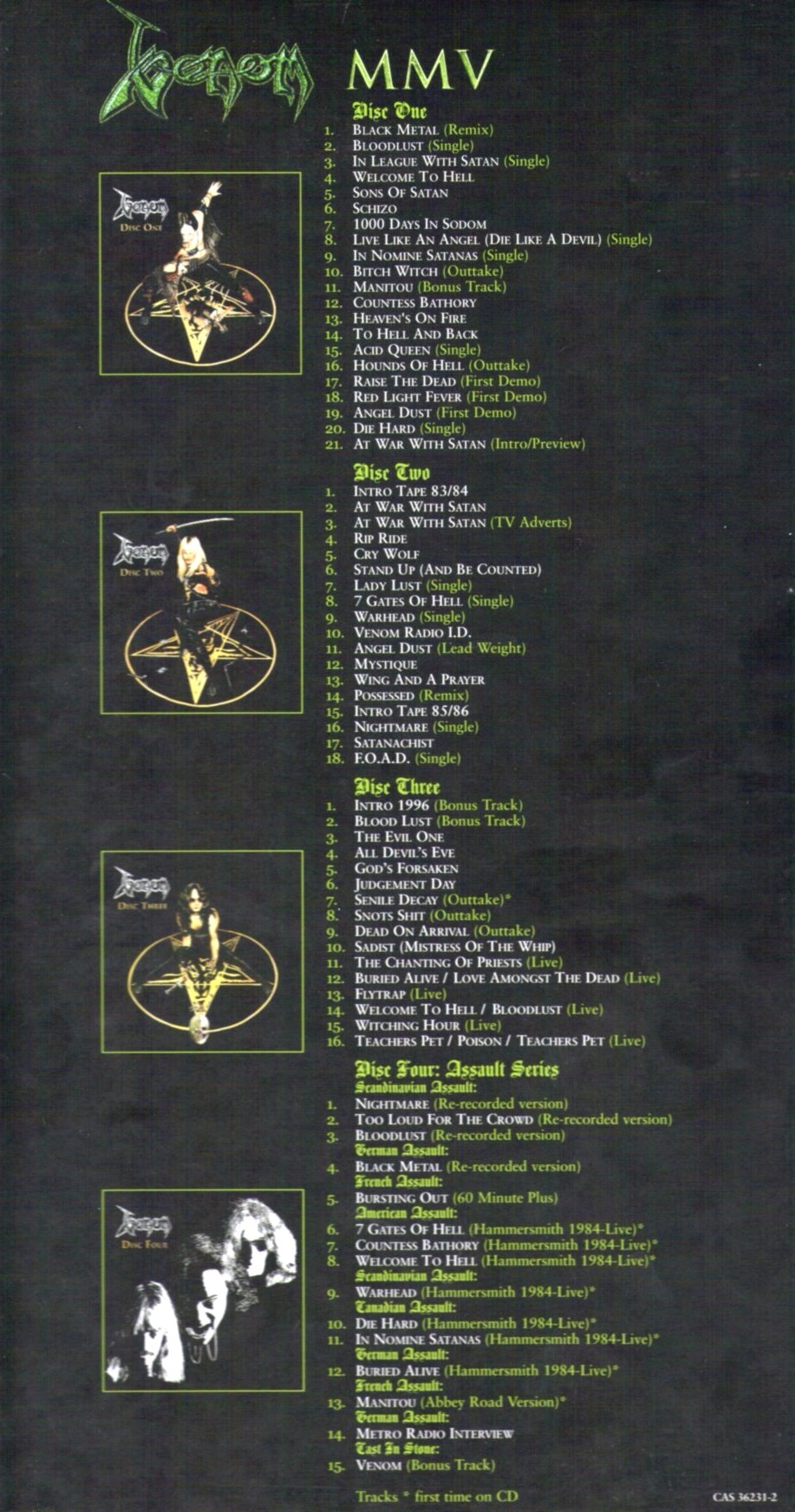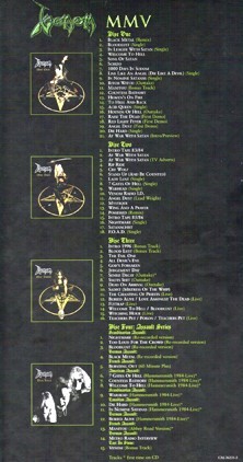 This boxset is one of the coolest and complete metal releases ever. It contains a heap of venom tracks. It also contains a mini-Black Metal poster and a 59 page over-sized, full-color book, detailing Venom's Career, with tons of rare and unseen pictures. This is a Venom lover's dream!