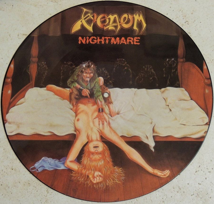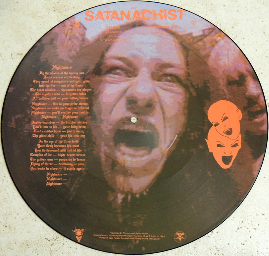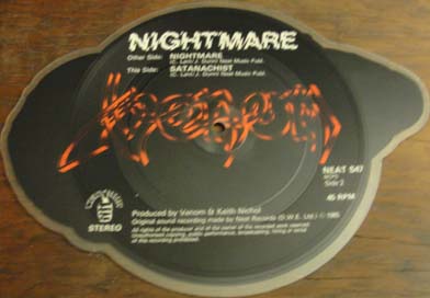 Here is a shaped picture EP from 1985 containing the tracks 'Nightmare' and 'Satanichist.'