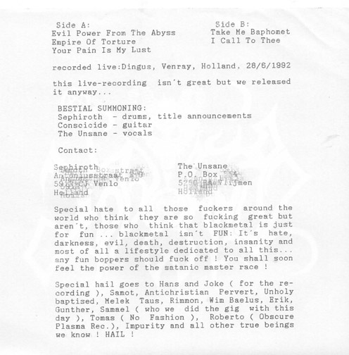 Advertised as a band that Euronymous of Mayhem hated... This is a 2012 re-issue of a 1992 live release by Bestial Summoning. The tracks can be viewed below.