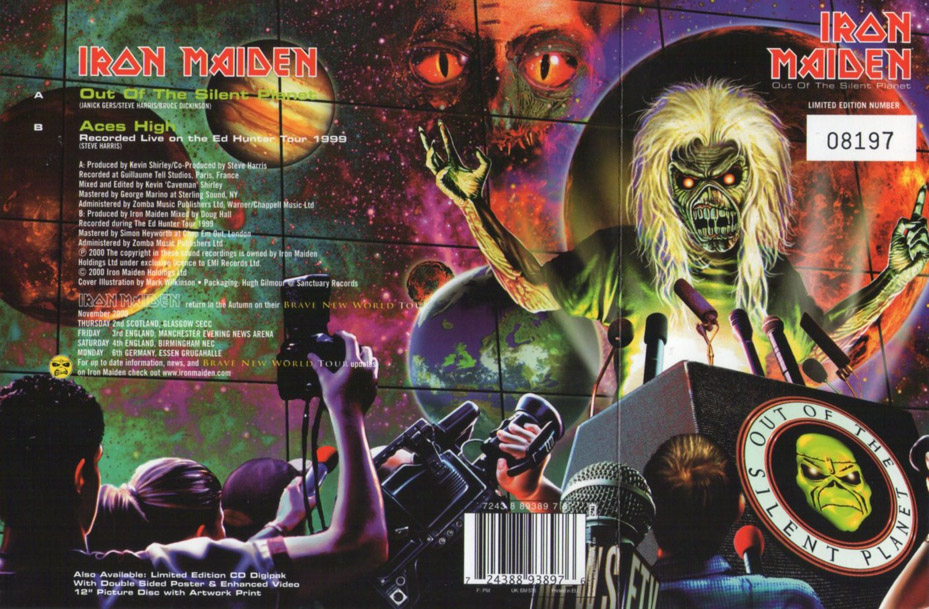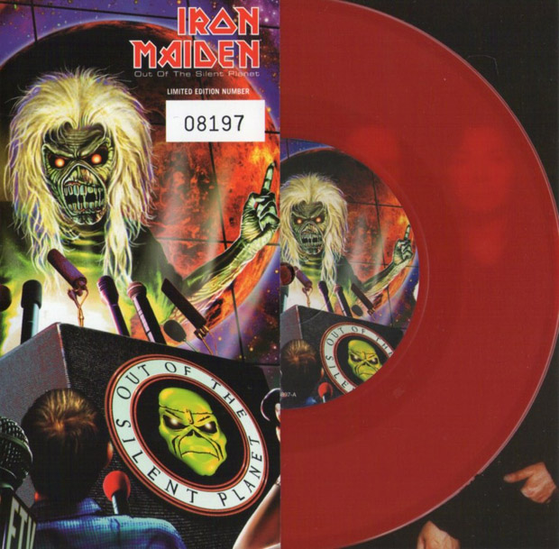 This limited edition colored seven inch was released in 2000. This was released long after I stopped listening to Iron Maiden. It's just not the same. Even Eddie isn't Eddie anymore. No longer drawn by Derek Riggs, but by someone named Mark Wilkinson... oh well, this contains the tracks 'Out of the Silent Planet' and 'Aces High' live, recorded in 1999.