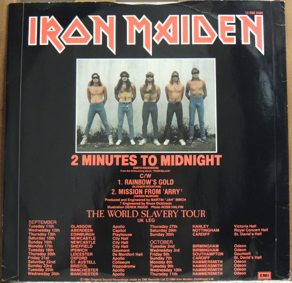This single was released in 1984 contains the tracks '2 Minutes to Midnight', 'Rainbow's Gold' and 'Mission from 'Arry'. Unlike the other version of this single on page twenty, this release has tour dates on the back from their UK World Slavery Tour.