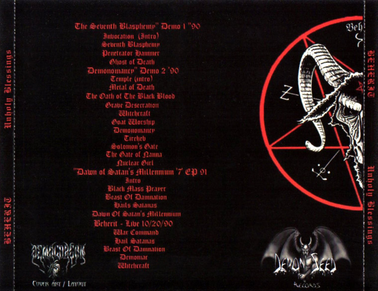 Another Beherit bootleg, this time it's loaded with material, which includes two demos, a 7 inch and live tracks. The first demo, 'The Seventh Blasphemy' (1990) includes the tracks:
