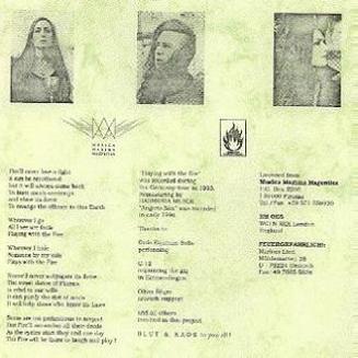 This super unique and ultra limited seven inch vinyl is by far one of the most attractive around. It is housed in an etched woodon box which the seven inch and cover slip into. Its also probably one of the most limited released we've seen, with only 23 made! It also contains four black and white postcard quality pictures of the band, and an old Ordo Equitum Solis concert ticket. It contains two songs, "Playing with the Fire (live)" and "Agnoris Nox."
