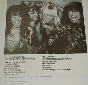 This rather strange double LP bootleg contains material from 1984, both live and rehearsal. It was limited to 500 copies, the first 25 containing a T-shirt. The strange thing about this release is one of the records is purposefully mislabeled as another 'band.' It reads, "Poverty Records, Buddy Love-Sings about Girls" and contains listings for 14 comical 'song' titles by this pseudo 'band.' This is obviously meant as a joke to confuse the buyer into believing the wrong record has been placed inside the sleeve. The other record label is blank, it is the first of the two and contains the live tracks from 'Alive and Undead sessions' : 'Evil has No Boundries* (misspelled),' 'Creator of Sin* (mislabeled, is actually 'Captor of Sin'),' 'Show no Mercy,' 'Black Magic,' 'Die by the Sword,' 'Aggresive Predator* (mislabeled, is actually 'Aggressive Perfector')' and 'The Antichrist.' The second 'Buddy Love' record contains the following: 'Praise of Death,' 'Necropheliac,' 'Hell Awaits,' 'Kill Again' and 'Warlock ('Crypts of Eternity' Edit).'
