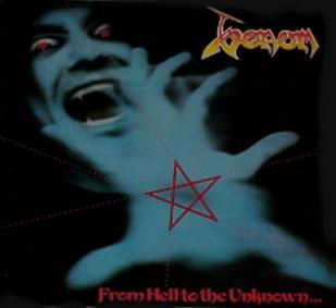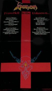 This "From Hell to the Unknown..." LP is probably equally as rare as most of the rarer picture LP's. It is gatefold, double LP, one of which is transparent red. It contains the following tracks: "Sons of Satan," "Welcome to Hell," "Schizo," "Mayhem with Mercy," "Poison," "Live like an Angel (Die like a Devil)," "Witching Hour," "1000 Days in Sodom," "Angel Dust," "In League with Satan," "Red Light Fever," "Bursting Out," "At War with Satan (intro)," "Die Hard (live version)," "Manitou," "Senile Decay," "Black Metal," "Possessed," "Seven Gates of Hell (live version)," "Buried Alive," "Too Loud for the Crowd" and "Radio interview (Metro Radio with Alan Robson)."
