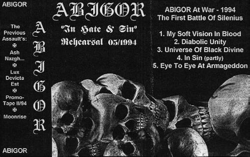 This tape is not an 'official' release, but instead was sent to just a few people (under 20), ourselves being one of those lucky few. It is best described in the history Peter sent with it, which is quoted in part here: 'After the removal of Tharen, several weeks after the 'Moonrise' demo had been released in March 1994, we had to find a new vocalist for Abigor, and finally we chose Silenius that we already knew of through our close contacts with Summoning at that time. We recorded a few songs of the planned debut album, entitled 'Verwustung/Invoke the Dark Age,' in early May 1994 to prove Silenius' voice, and to inform Napalm Records about the line-up change, and to show them the 'new' Abigor. The tape was called 'In Hate and Sin' and it featured the songs: 'My Soft Vision in Blood,' 'Diabolic Unity,' 'Universe of Black Divine,' 'In Sin (partly)' and 'Eye to Eye at Armageddon.' ...the demo will never be released, nor will I ever dub more than 20 copies of the tape.'