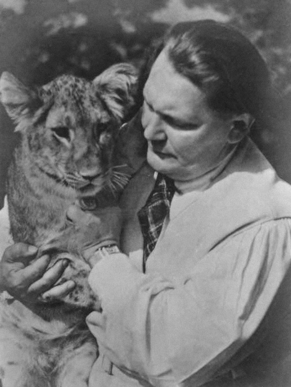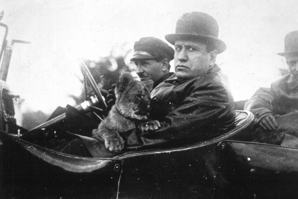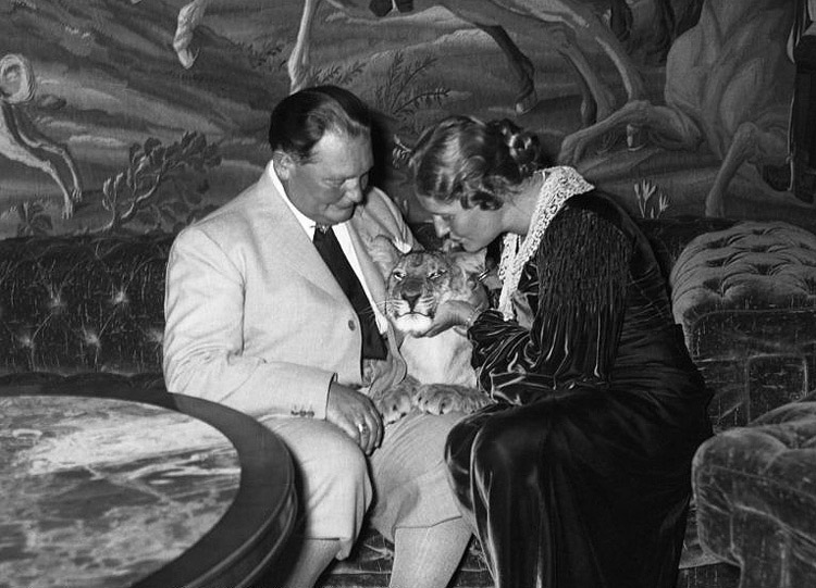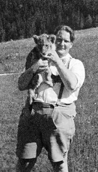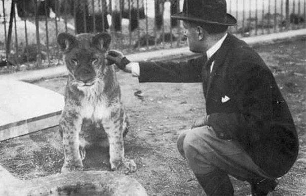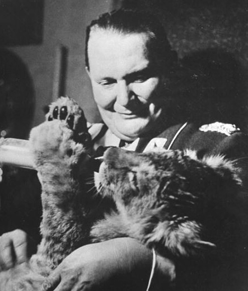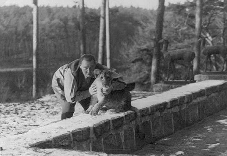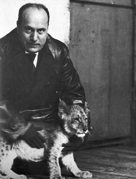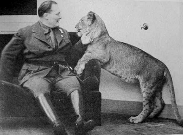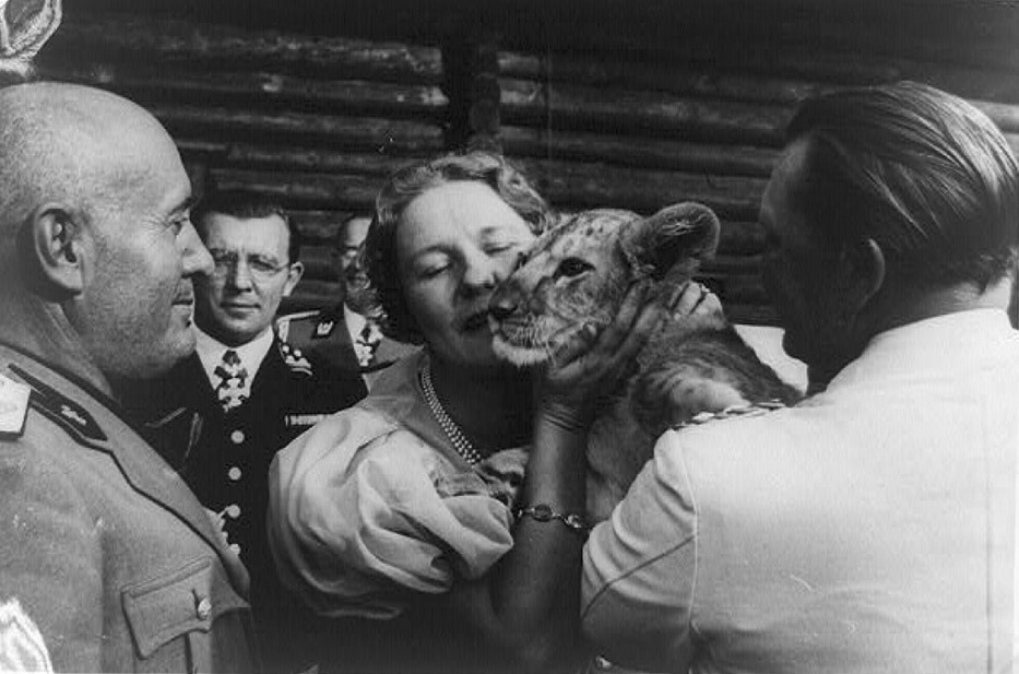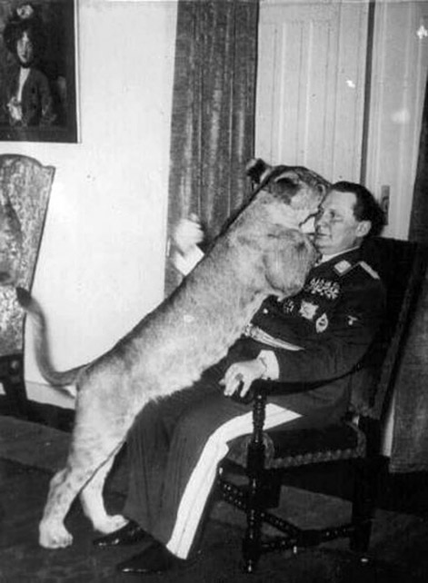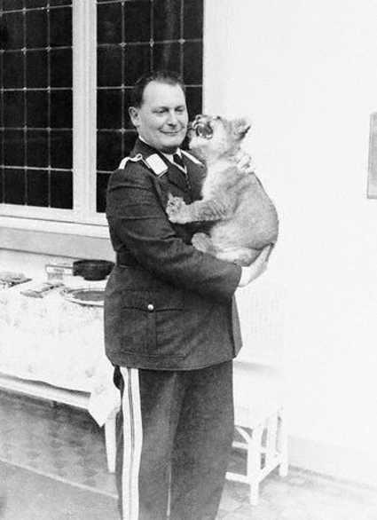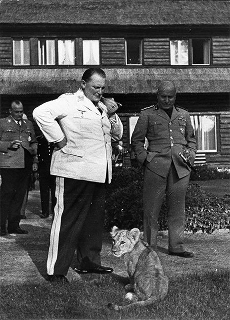 [Above: Hermann Göring and his wife Emmy show off their lion cub named Mucki to Benito Mussolini.]