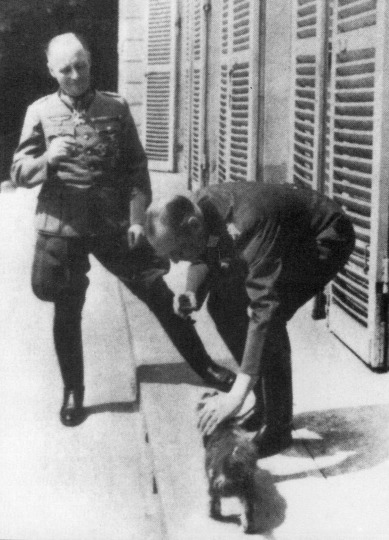 [Above: Rommel watches as Field Marshal Gerd von Rundstedt pets one of his (Rommel's) dogs, spring 1944.]