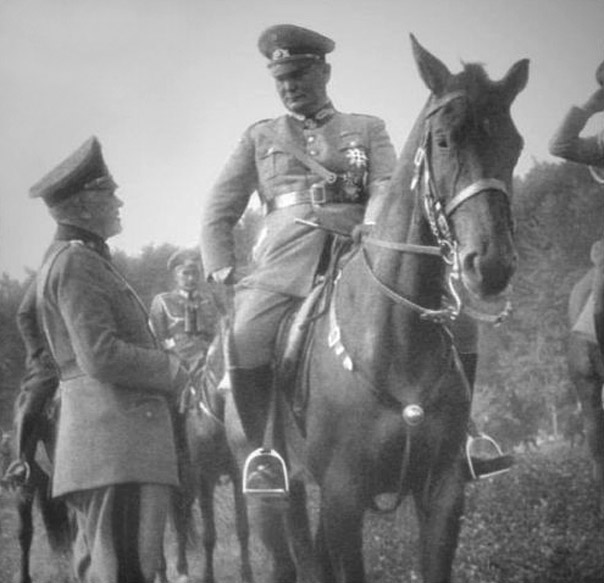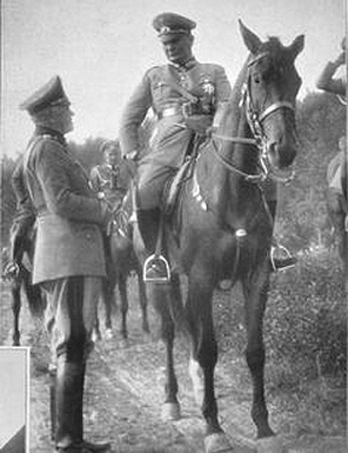 [Above: Hermann Göring on a horse talking with Werner von Blomberg.]