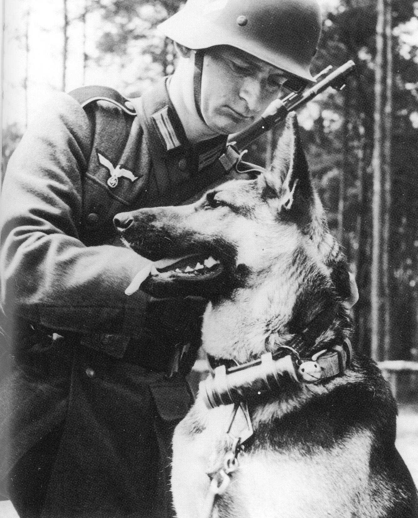 [Above: "Kamerad". Note the collar the handler is holding -- the tubular device is for messages on the front.]