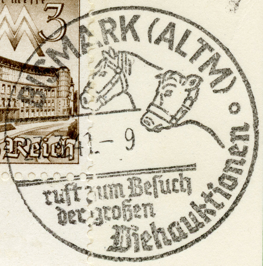 [Above: This says: 'Ein Zeichen der Zeit als Naturwunder! geb. 22.10.33 zu Wrist in Holstein beim Landmann Max Granzow.' (A sign of the times as a natural wonder! Born 22.10.33 at Wrist in Holstein to the farmer Max Granzow). You'll note that this cow has a (incomplete) swastika on its head!]