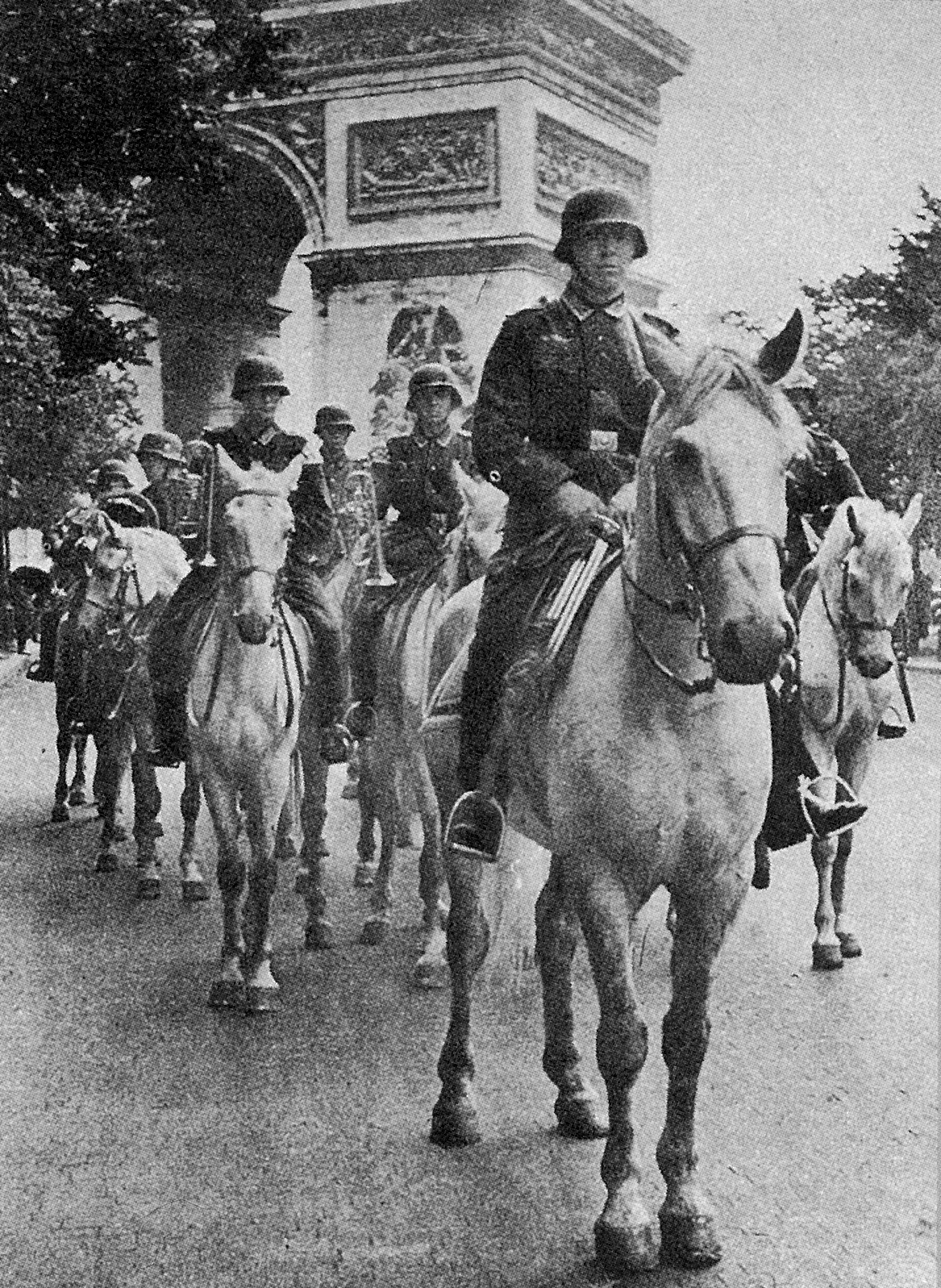 [Above: Mounted band awaiting the parade on the Avenue Foch, with the Arch of Triumph in the background.]