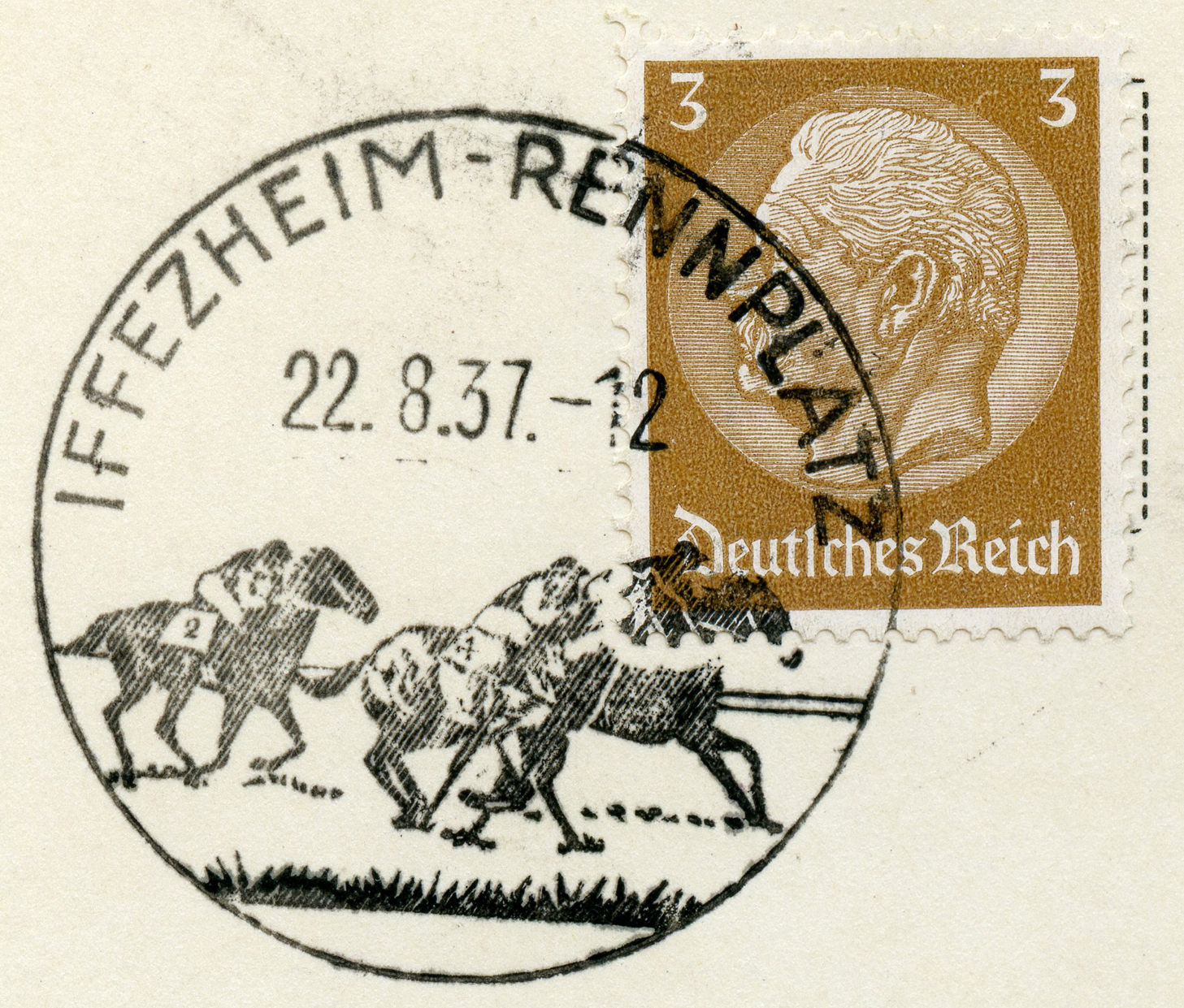 [Below: Postcard with rare horse racing cancel from August 22, 1937.]