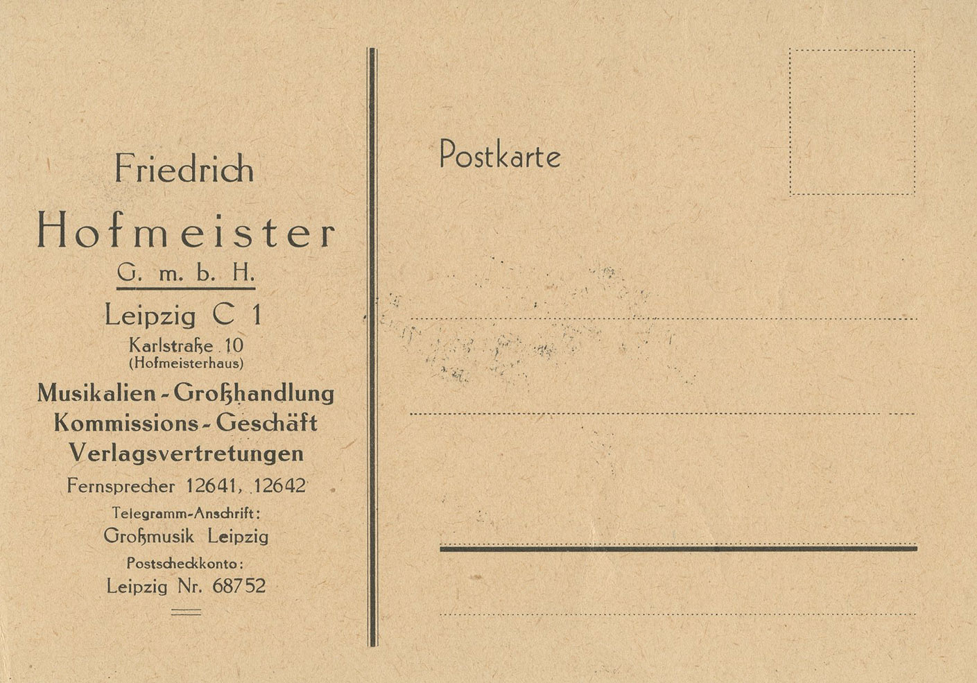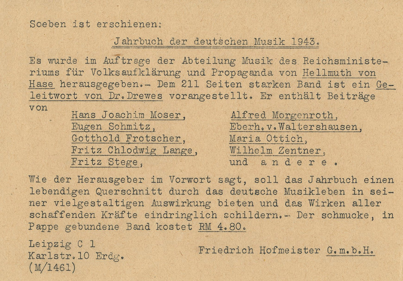 [Below: Postcard inside book - this is to order another book called 'Jahrbuch der deutschen Musik 1943' (Yearbook of German Music 1943) - front]