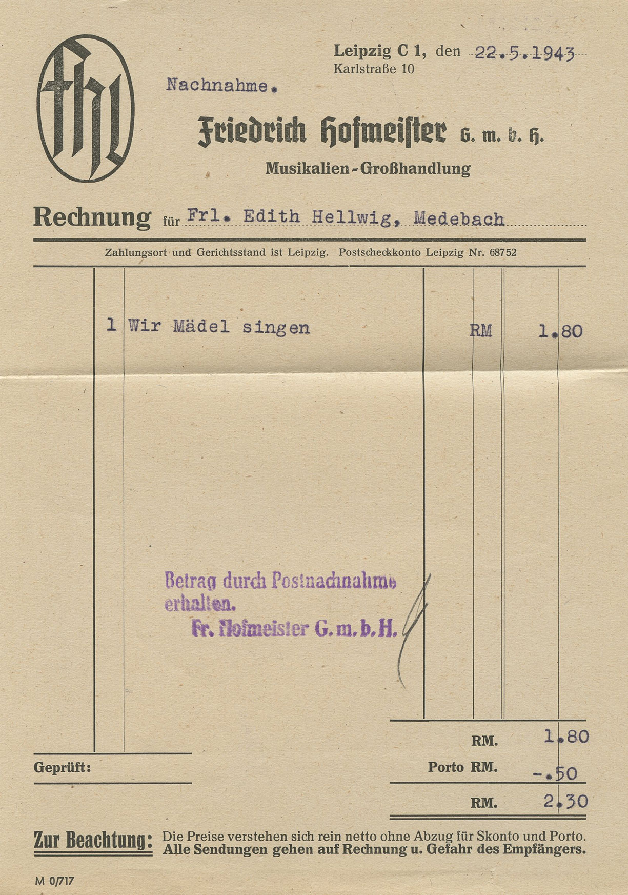 [Below: Here is the actual receipt for the purchase of this book, which was also pressed inside the book. It's made out to Fraulein Edith Hellwig from Medebach, a town in North Rhine-Westphalia, Germany. Medebach today has a little less than 8,000 souls.]