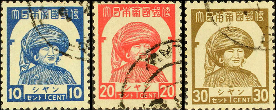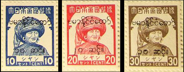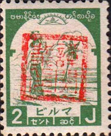 [Below: Burmese girl with a water jug and Burmese woman in traditional dress stamps both overprinted with Japanese characters.]