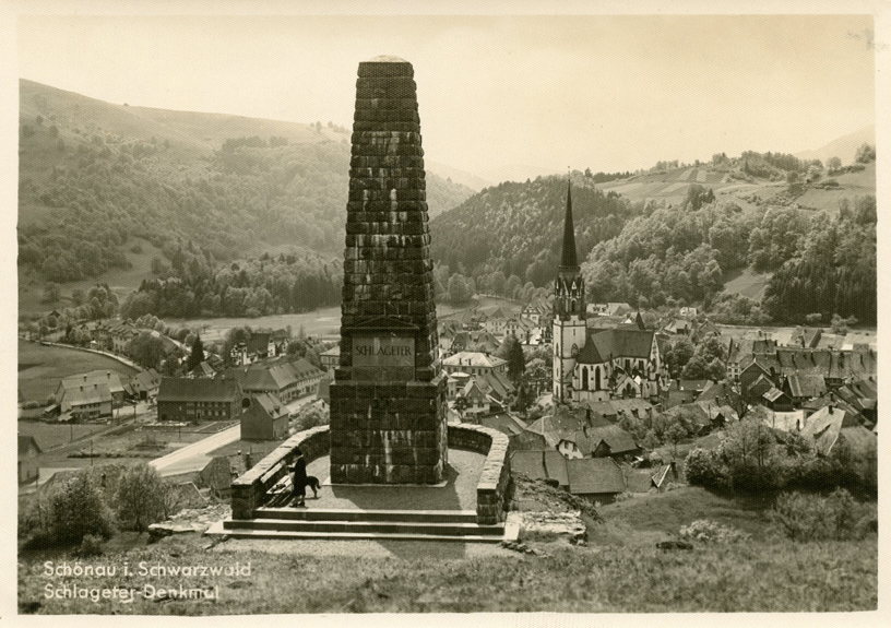 [Above: Another postcard showing the Schlageter monument above the town of his birth, along with a picture of the Schlageter house and the monument in Schönau, Germany.]