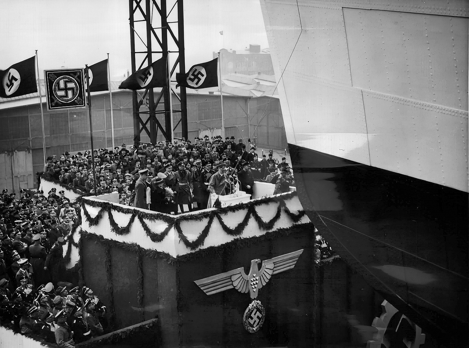 [Below: Adolf Hitler speaks at the launching ceremony of a new ship.]