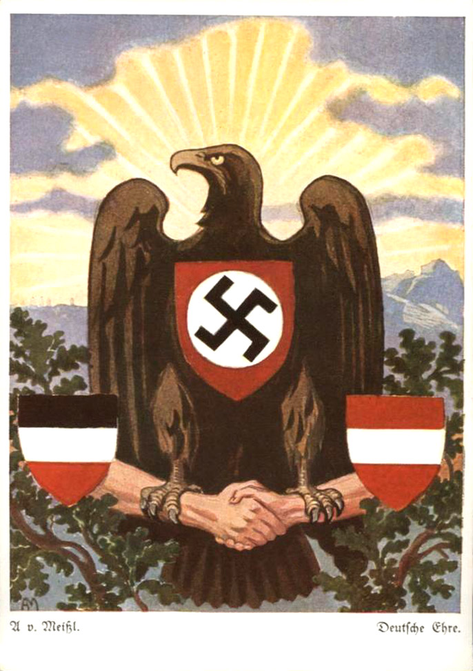 [Below: A rare and beautiful postcard showing Germany and Austria shaking hands. In the bottom right hand corner it says 'Deutschland Ehre' (German Honor). The back says 'Verlag für Nationale Bild Kunst' (Publishing House for National Picture Art).]