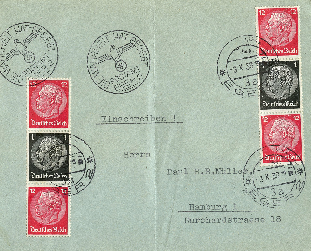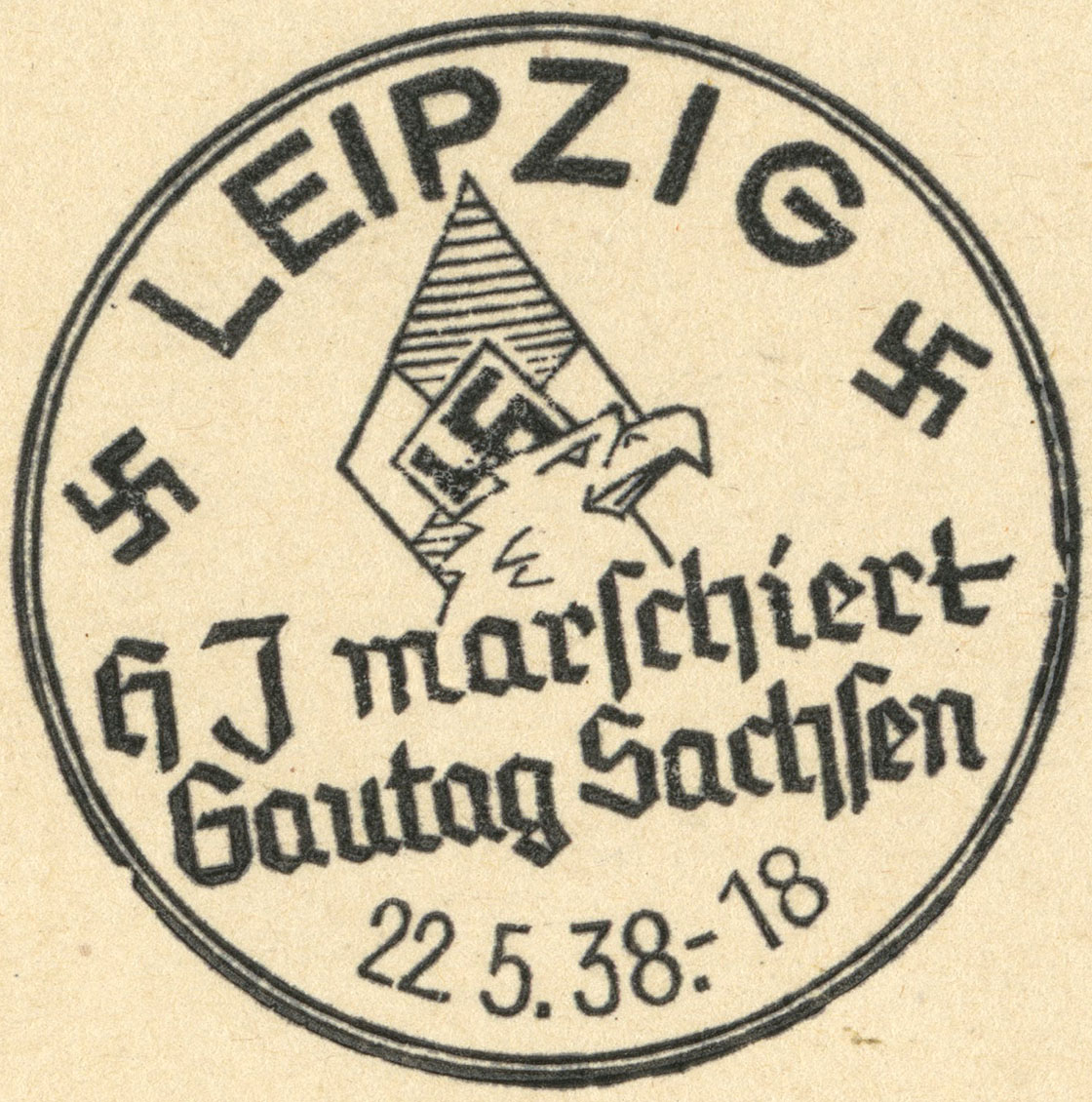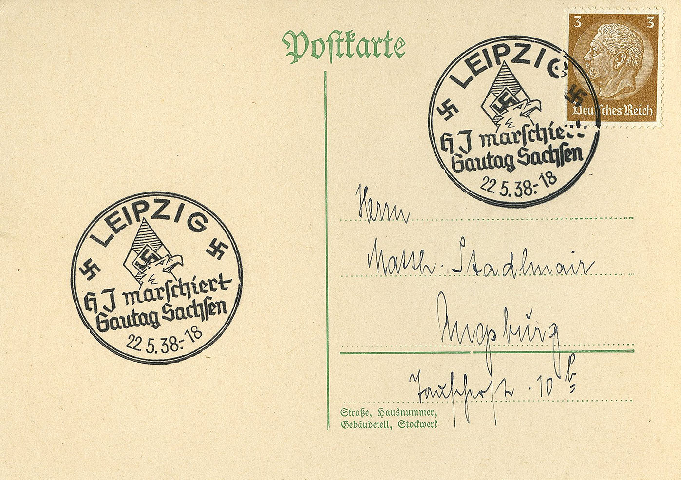 [Below: The Hitler Youth cancel on this postcard is amazingly cool. This special cancel commemorates a Hitler Youth parade in Leipzig on May 22, 1938.]