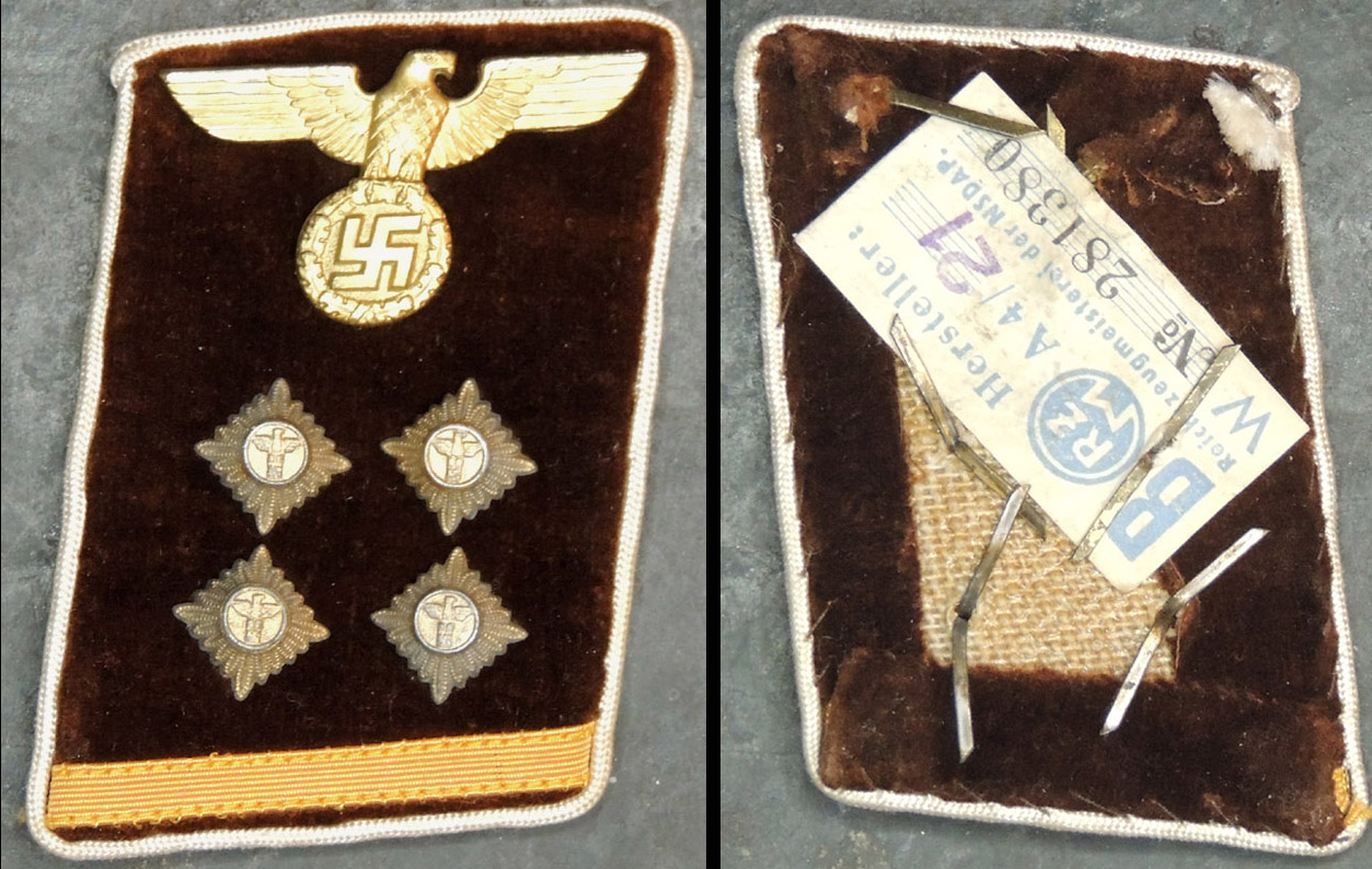 [Below: Is this cool or what? It's a Political Leader collar tab. It would have been worn by a 'OberGemeinschaftsleiter' (Chief Community Leader) at the 'Kries' level. The back of the tab is brown velvet. Front/back.]