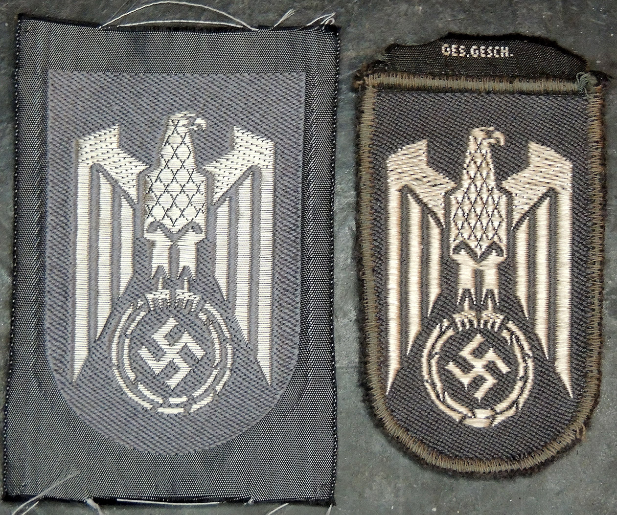 [Below: This is a shirt patch of the 'Deutsche Lebens-Rettungs-Gesellschaft or DLRG' (The German Life Saving Association). This organization is still around today, in fact it is the largest voluntary lifesaving organization in the world. This picture shows two varieties of the patch.]