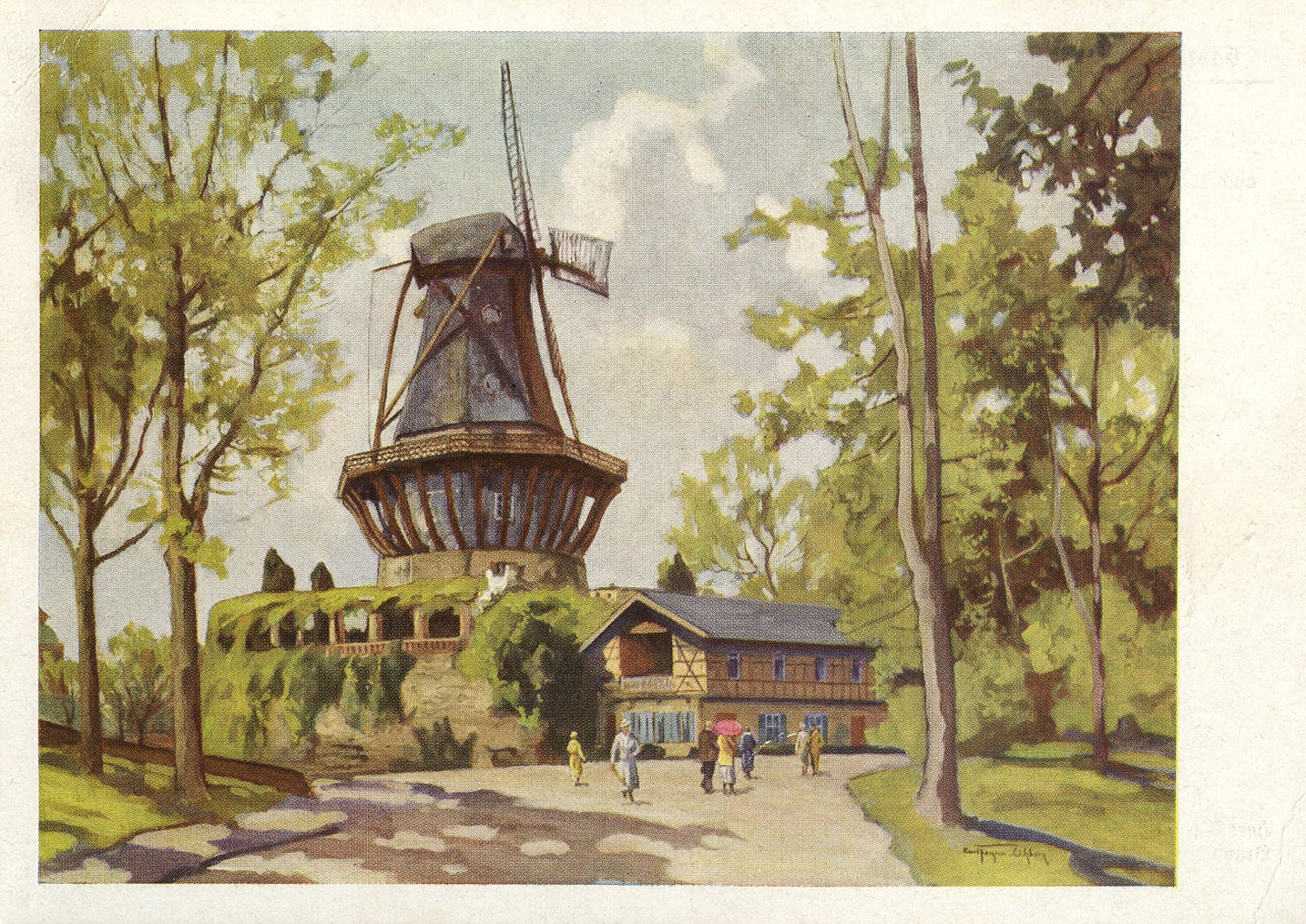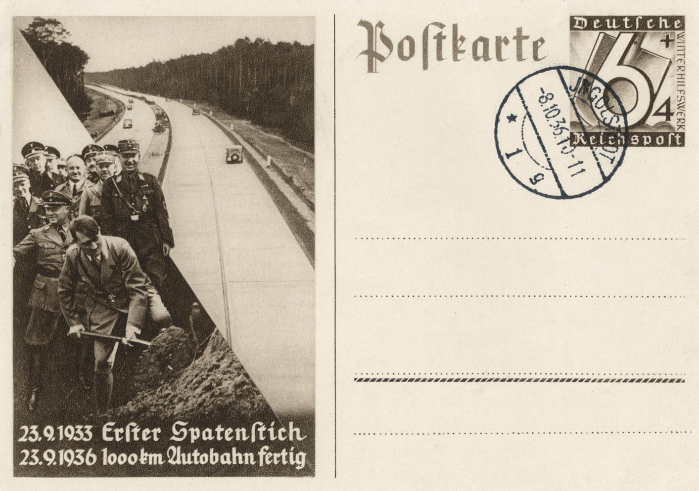 [Below: Here's a related postcard showing Adolf Hitler scooping the first shovel of dirt for the Autobahn. It says '23.9.1933 Erster Spatenstich (23.9.1933 Groundbreaking ceremony