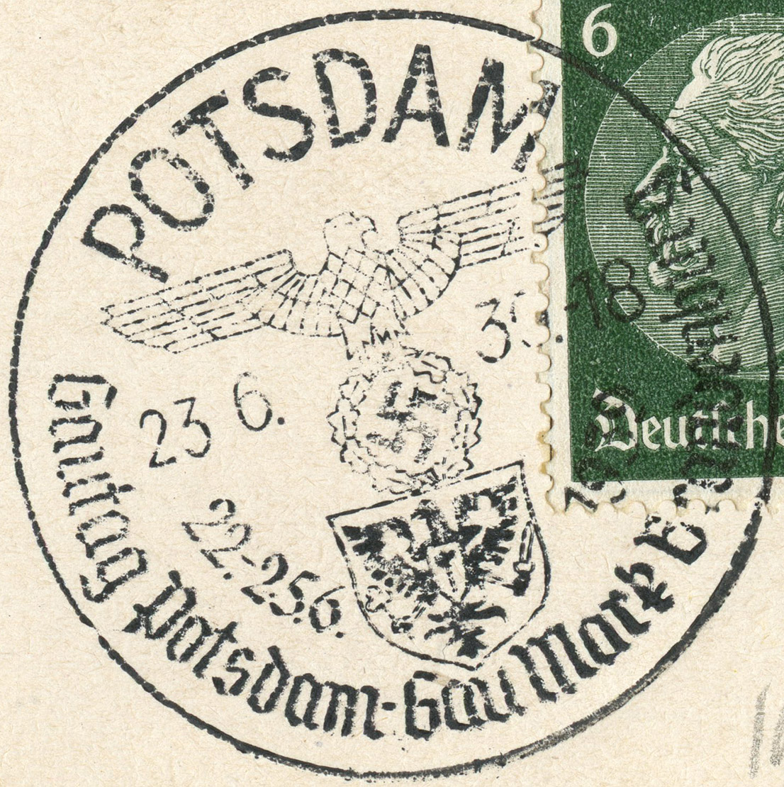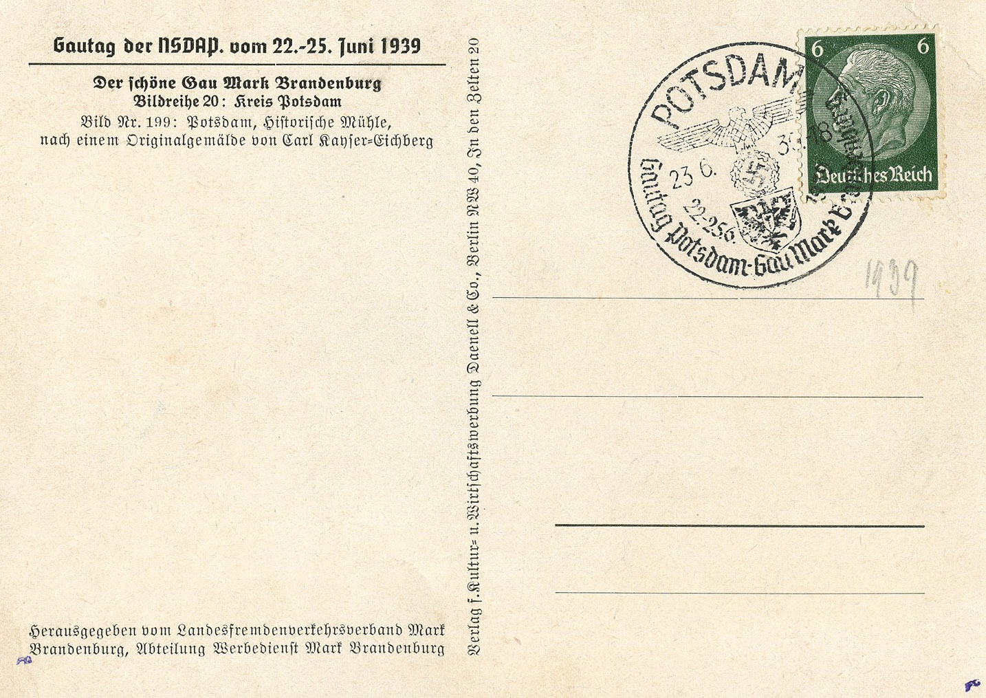 [Below: Postcard back. This celebrates 'Gautag (region/district) of the NSDAP. from 22 to 25 June 1939' and has a commemorative cancel from Potsdam.]