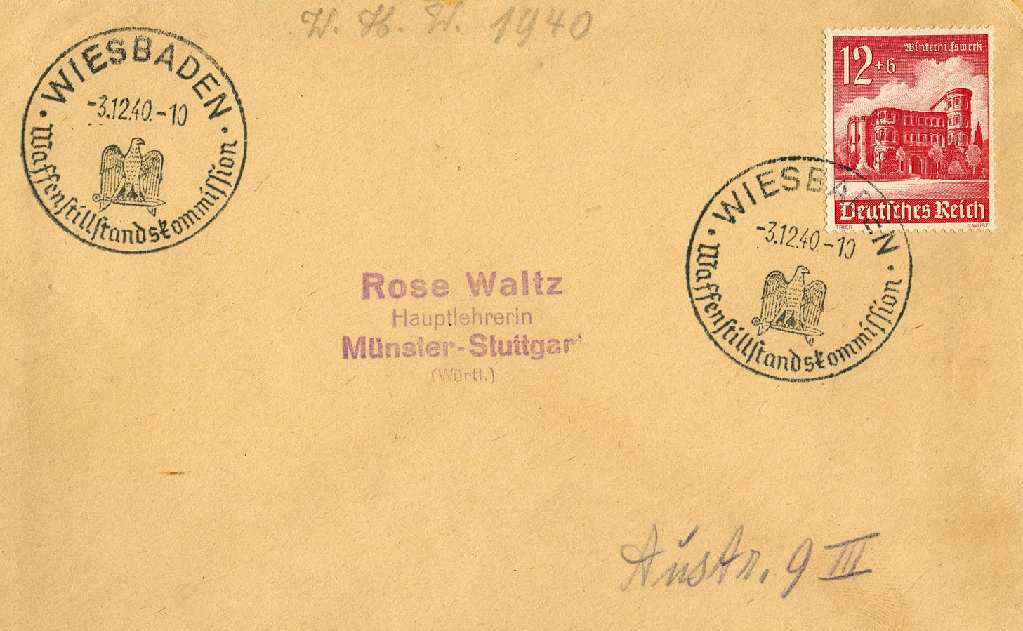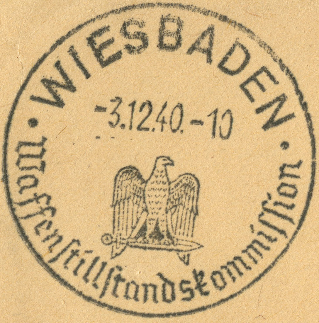[Below: This envelope was canceled on December 3, 1940 in Wiesbaden and says 'Waffenstillstandskommission' (Armistice Commission).]