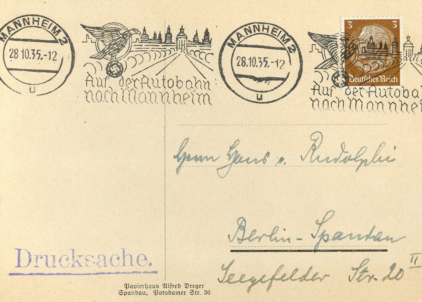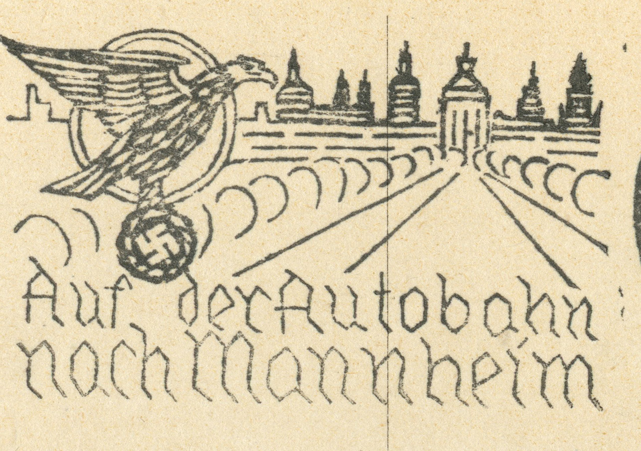[Below: This postcard was canceled on October 28, 1935 in Mannheim and says 'Auf der Autobahn nach Mannheim' (On the Motorway to Mannheim). The German Autobahn, like so many other National Socialist inventions, revolutionized the world's highway systems.]