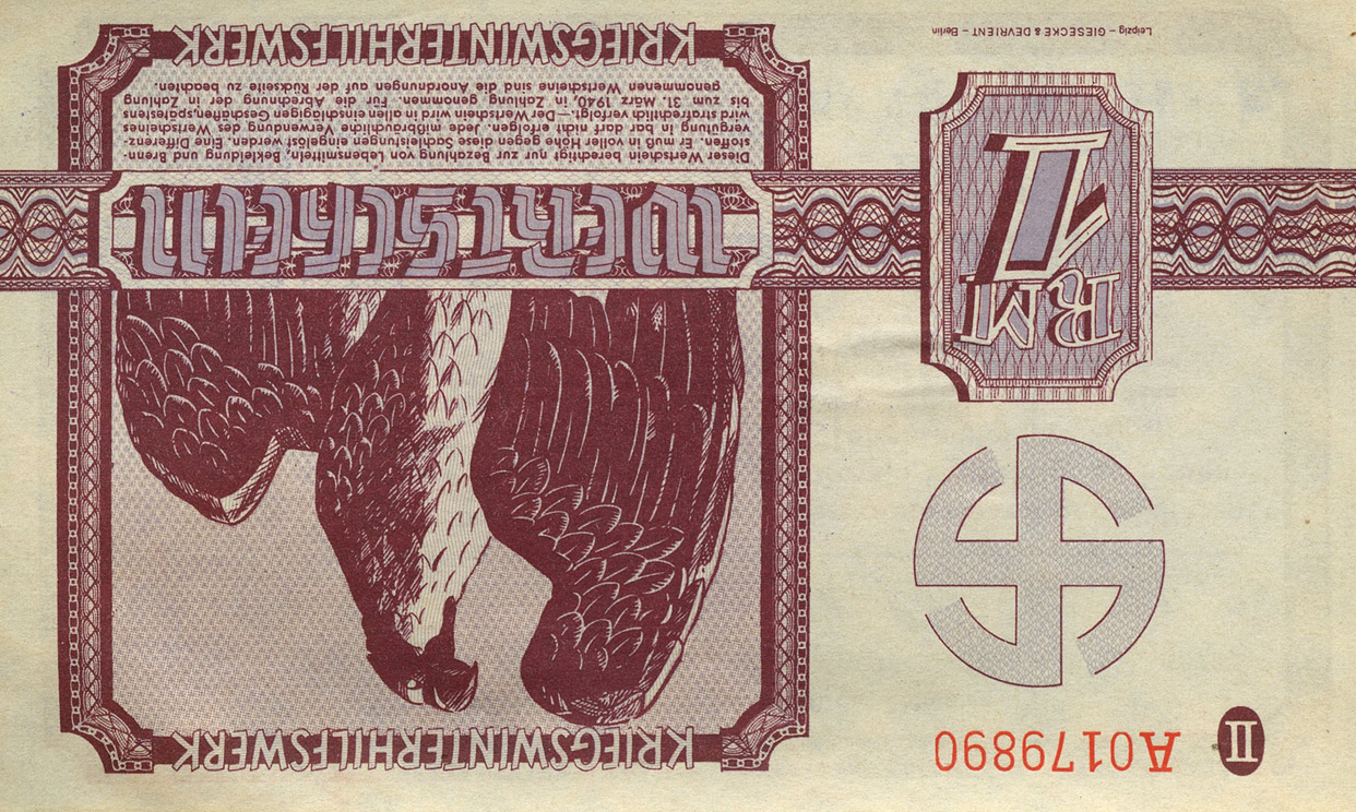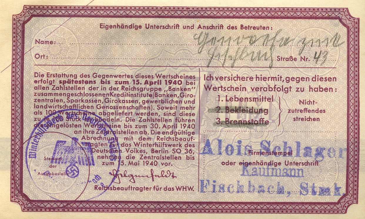 [Below: A 1940 Winterhilfswerk [WHW] (Winter Charity) voucher for 1 RM - reverse.]