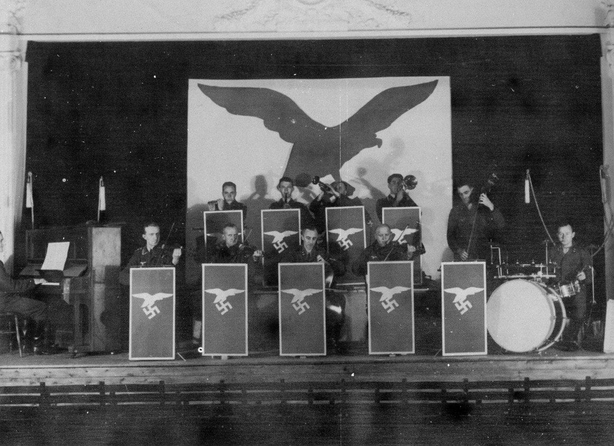[Below: This is quite an uninspired-looking Luftwaffe banner! It looks kind of like a seagull.]