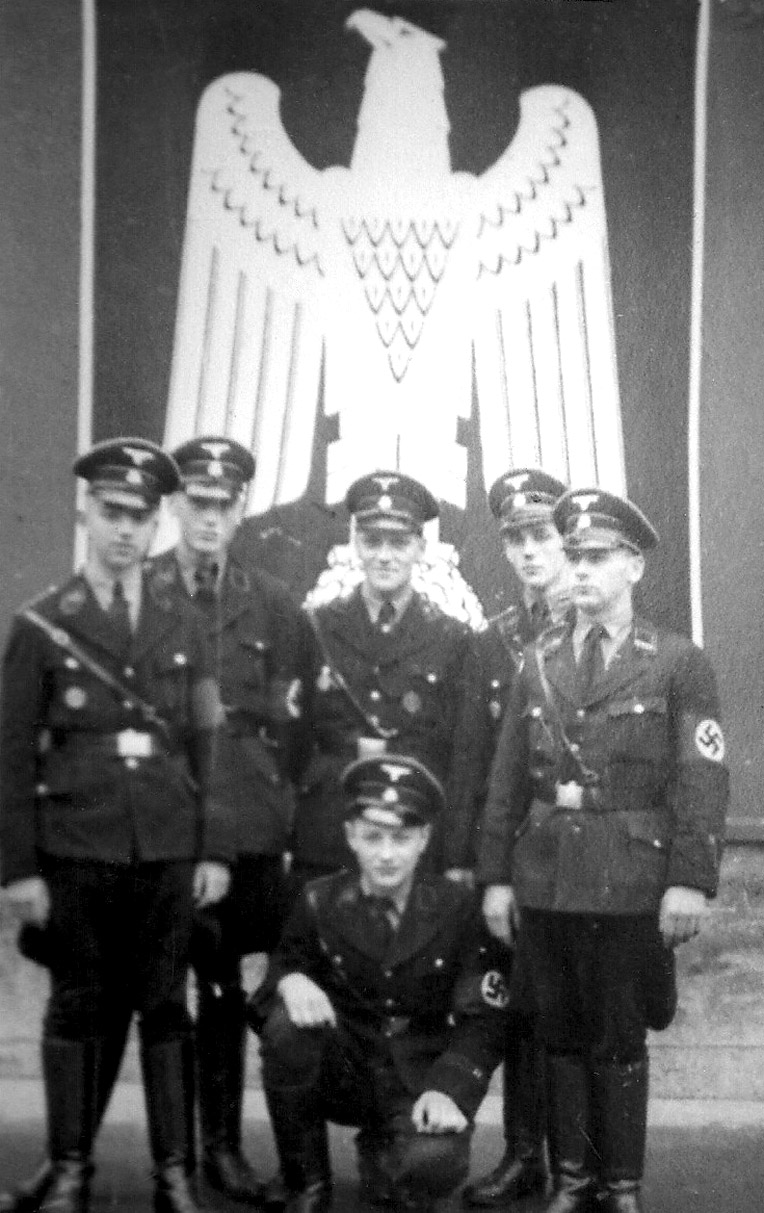 [Below: A group of SS men stand in front of a cool eagle tapestry.]