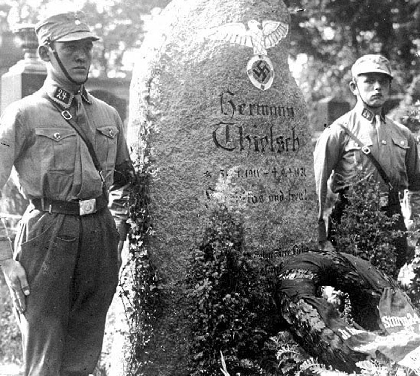 [Below: Two SA men guard a monument to martyr Hermann Thielsch (January 30, 1911 - September 9, 1931).]