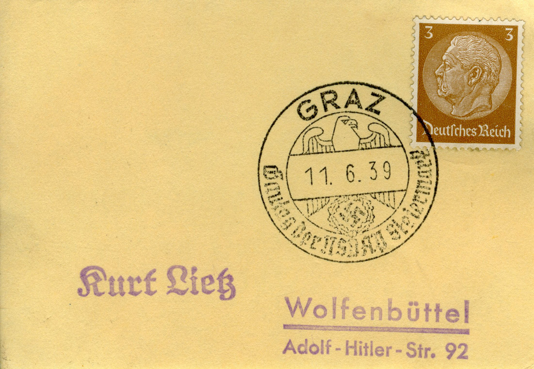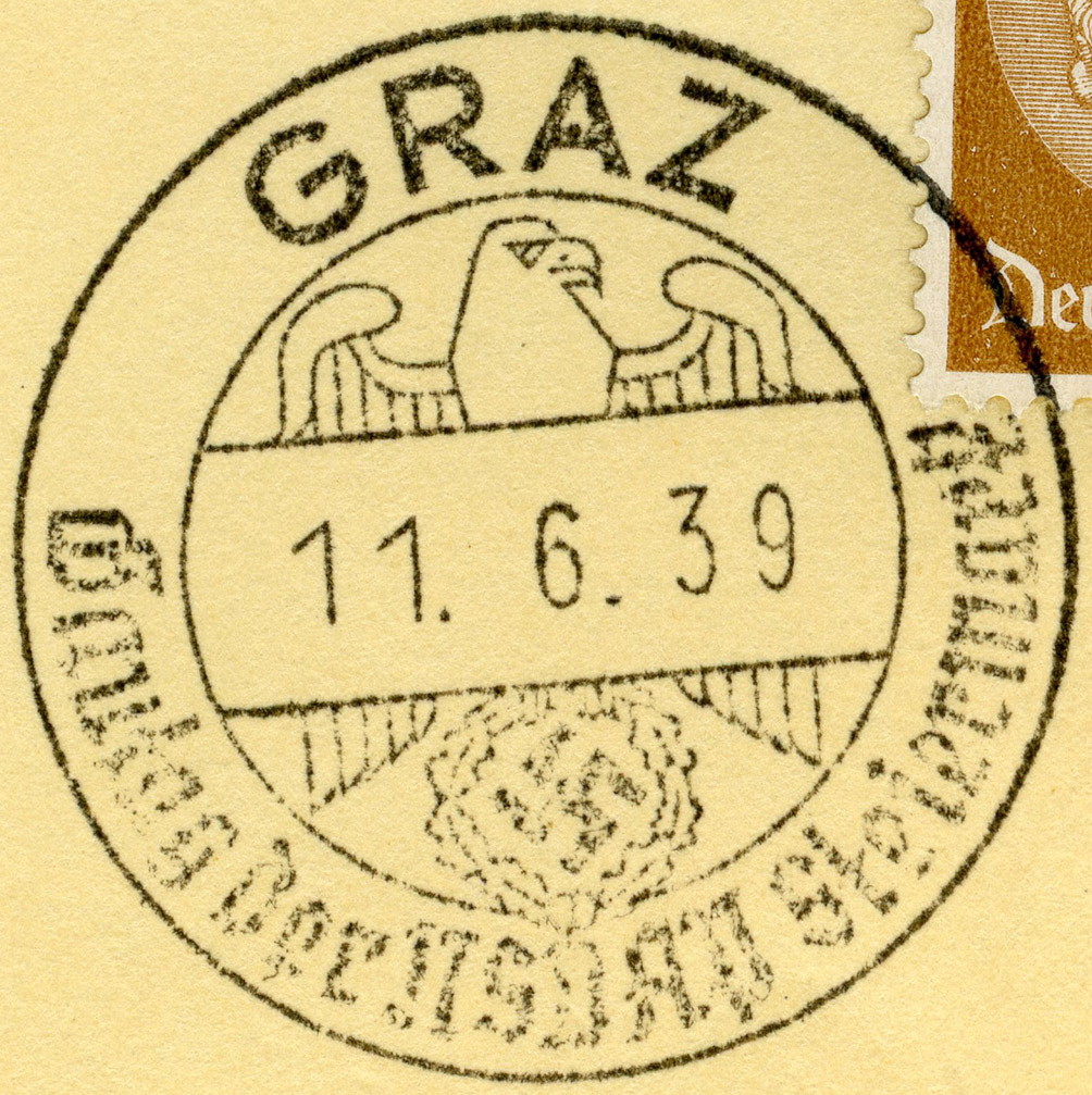 [Below: A postcard with a cool eagle canceled in Graz on June 11, 1939.]