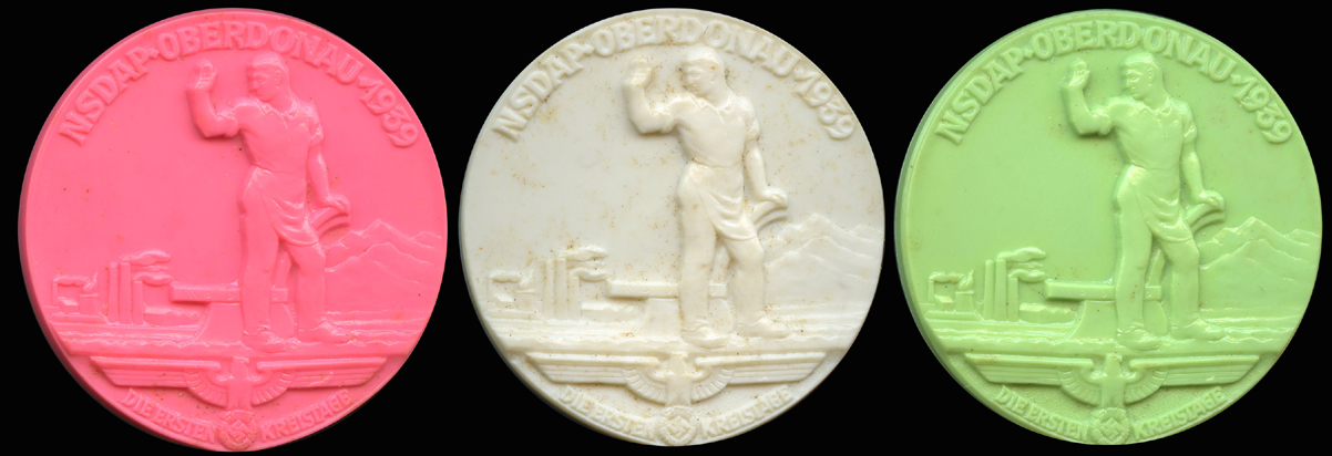 [Below: These plastic/bakelite Third Reich 'tinnies' are so strange and cool. The colors they used are very striking. They say 'NSDAP - Oberdonau- 1939 - Die Ersten Kreistage' (NSDAP - Upper Danube - 1939 - The First District Assemblies). Click to enlarge: