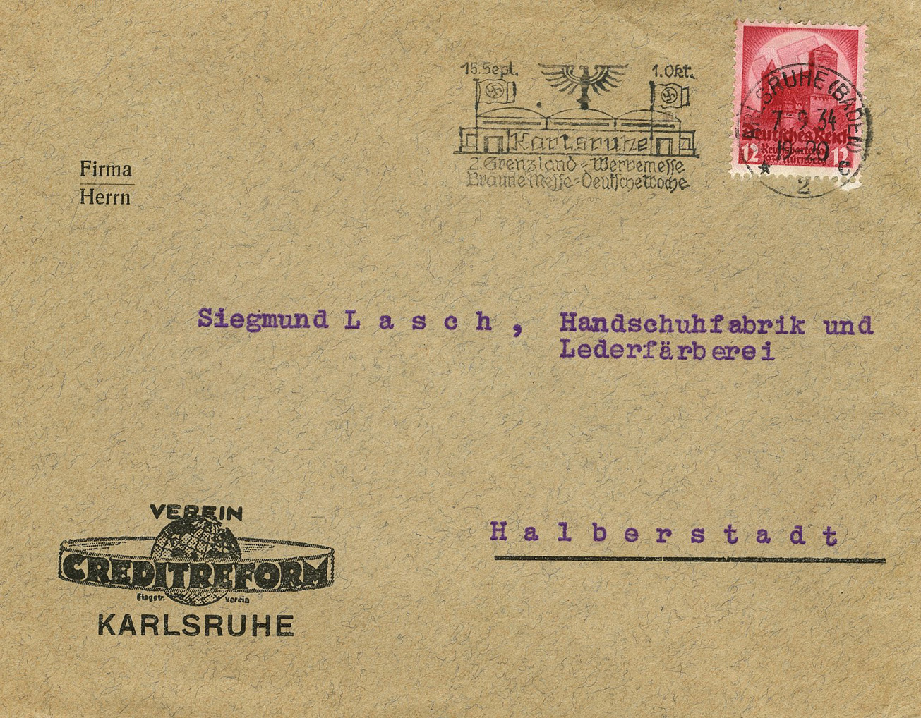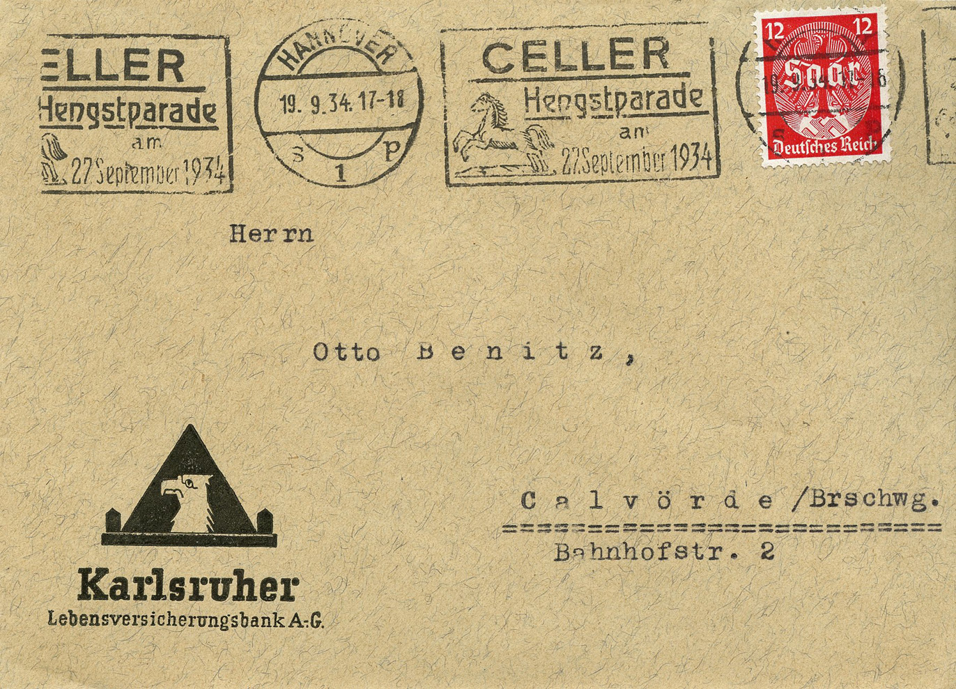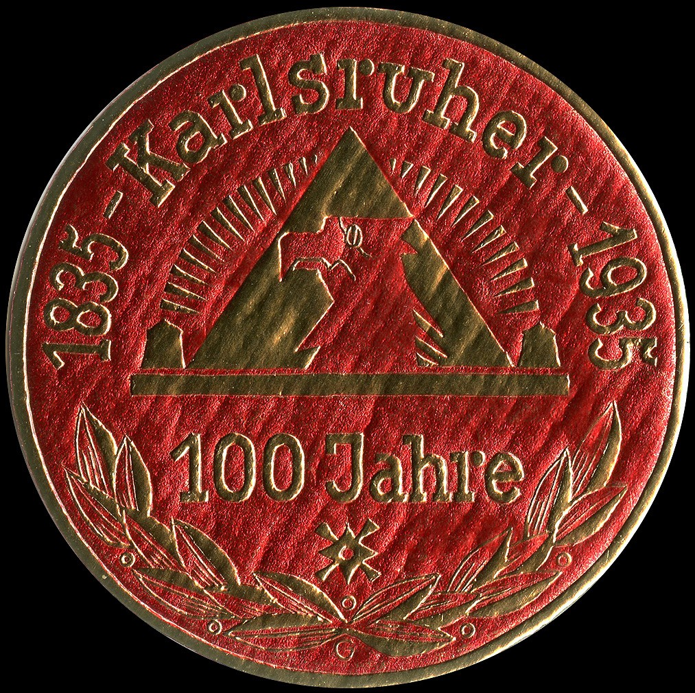 [Below: A 1935 foil advertising stamp from the Karlsruhe Life Insurance Bank.]