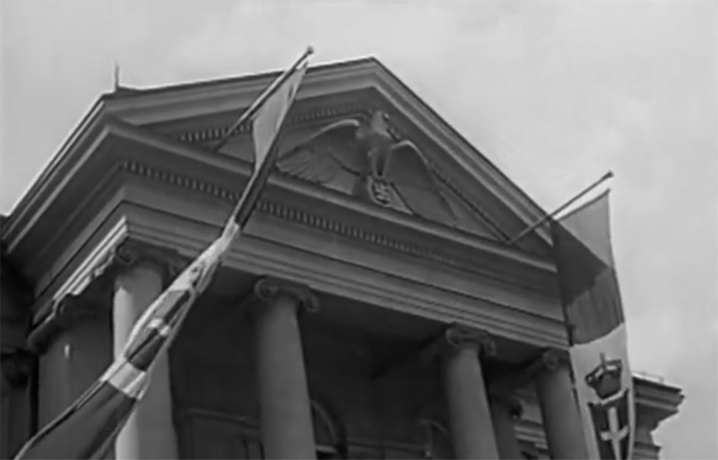 [Below: Wow, this is very cool. Ok, they aren't eagles, but the griffins are beautiful. This has something to do with the Reich Labor Force (RAD), due to the symbol on the guard booth.]