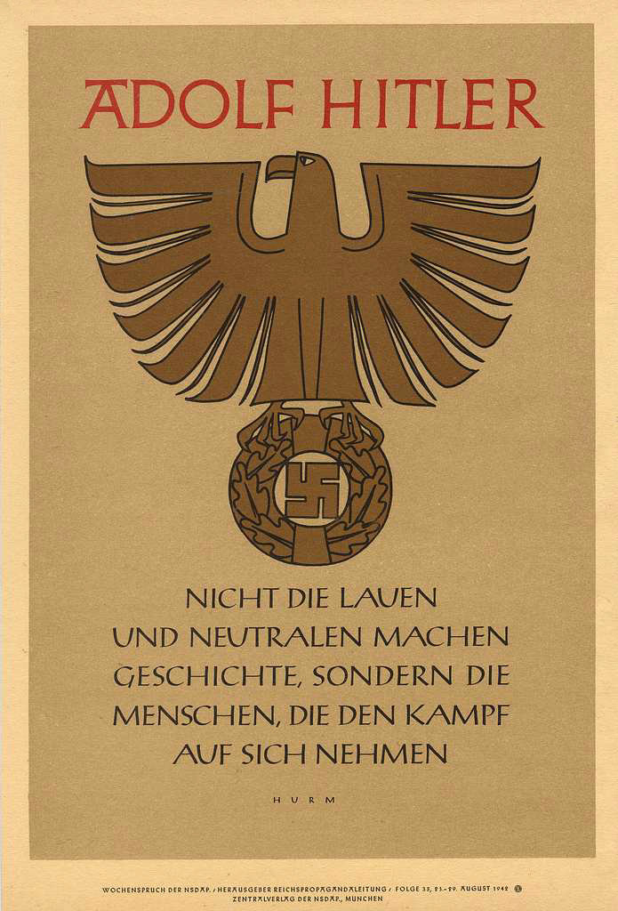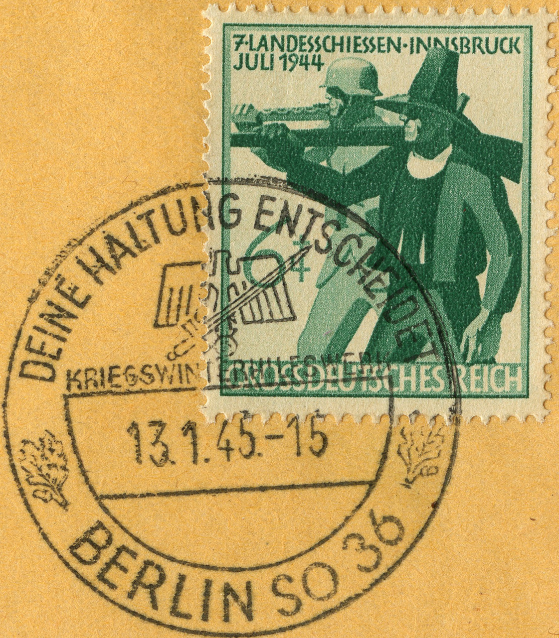 [Below: This late war postage stamp, bearing a WHW (Winterhilfswerk) eagle, with a sword across its chest, is postmarked on January 13, 1945, and says 'Deine Haltung Entscheidet - Kriegswinterhilfswerk' (Your Attitude Decides - War Winter Relief Fund).]