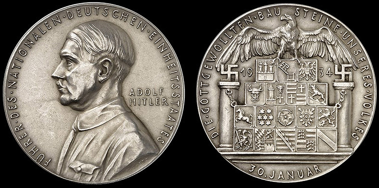 [Below: Silver commemorative coin featuring Adolf Hitler.]