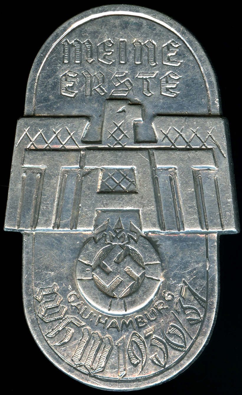 [Below: 1936/1937 Winterhilfswerk [WHW] (Winter Charity) aluminum tinnie pin. 'Meine Erste' (My First). I'm unsure what the TAT stands for...?]