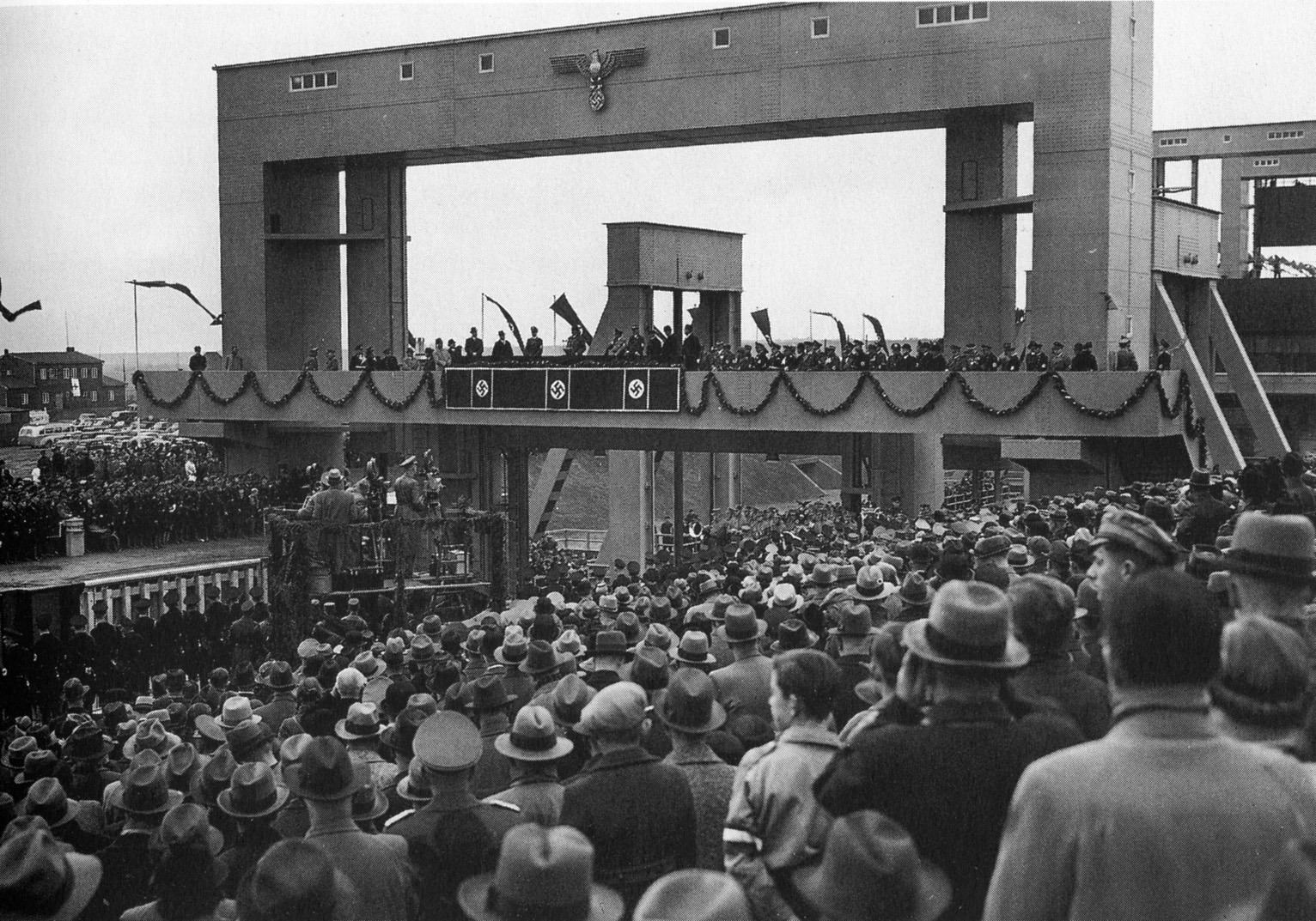 [Below: This picture is celebrating Germany's new built-up transport network. Rudolf Hess is speaking at the opening of a new stretch of canal.]