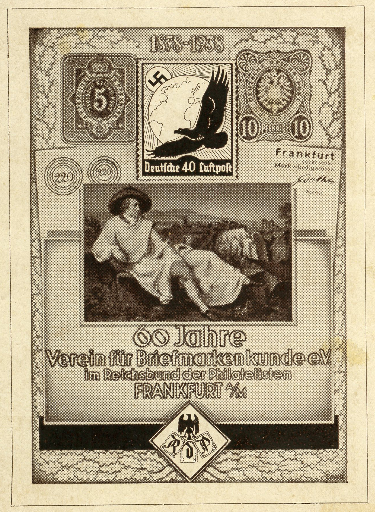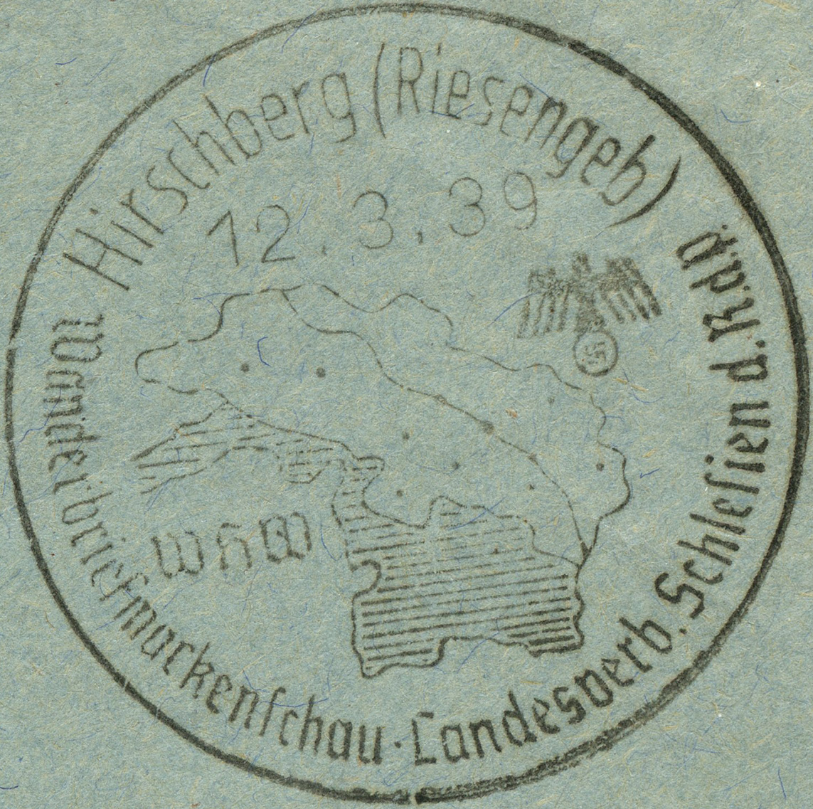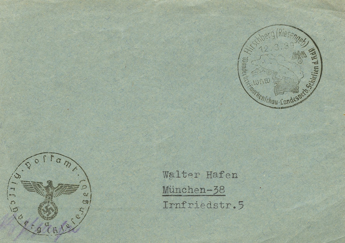 [Below: This is a postage free government envelope postmarked on March 12, 1939. In the corner is a cancel from the WHW (Winterheilfswerk) advertising a stamp show.]