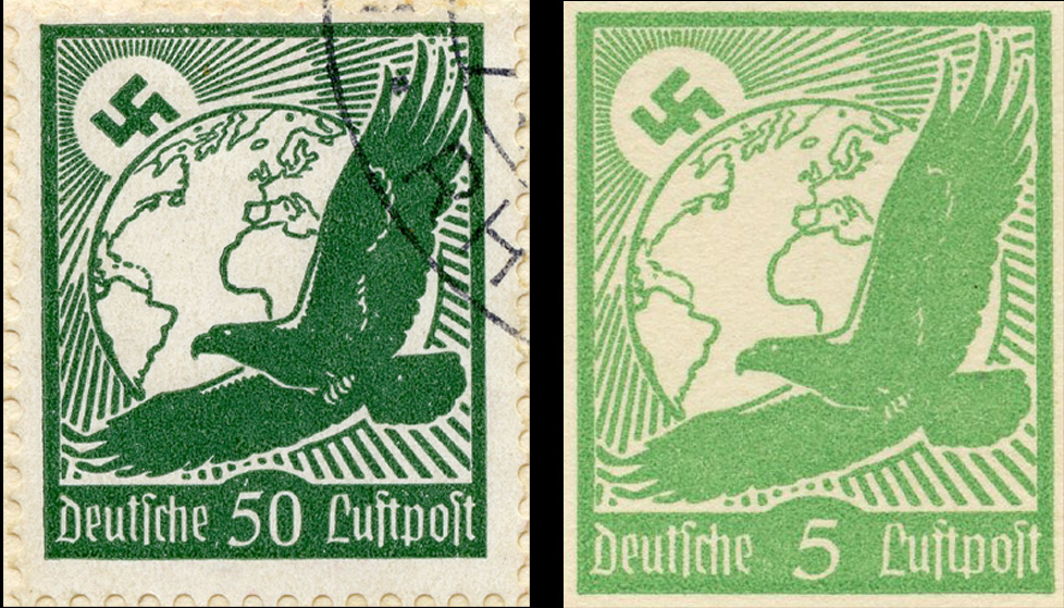 [Below: Airmail postage stamps, the one on the left is a regular adhesive postage stamp, while the other is from a prepaid postcard. Also note below this is the stamp used in another postcard design.]