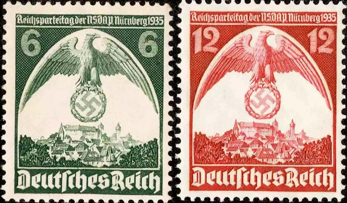 [Below: Postage stamps commemorating the 1935 Reichsparteitag.]